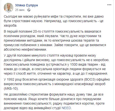"Сегодня мы разрушаем мифы и стереотипы, которые уже давно были опровергнуты наукой. Например, что гомосексуальность - это болезнь. В первой половине 20-го века гомосексуальность считалась психическим расстройством, который лечили. Часто очень жестокими и унизительными методами, как электрическая шоковая терапия и принудительные свидания с женщинами. Излишне говорить, что это оказались совершенно неэффективными", - написала она.