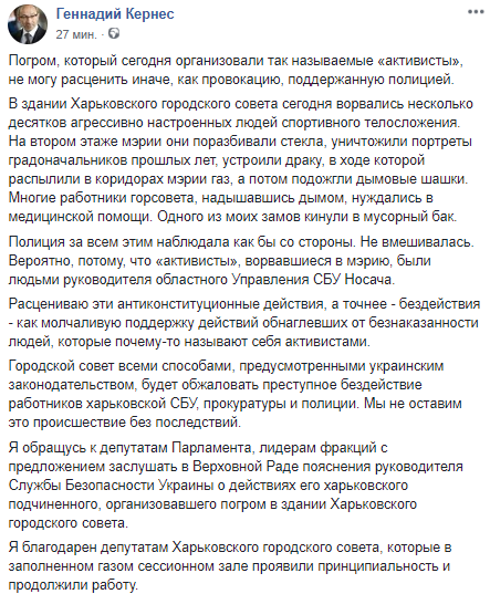 "Погром, который сегодня организовали так называемые "активисты", не могу расценить иначе, как провокацию, поддержанную полицией. В здании Харьковского городского совета сегодня ворвались несколько десятков агрессивно настроенных людей спортивного телосложения. На втором этаже мэрии они поразбивали стекла, уничтожили портреты градоначальников прошлых лет, устроили драку, в ходе которой распылили в коридорах мэрии газ, а потом подожгли дымовые шашки. Многие работники горсовета, надышавшись дымом, нуждались в медицинской помощи. Одного из моих замов кинули в мусорный бак", - написал мэр.