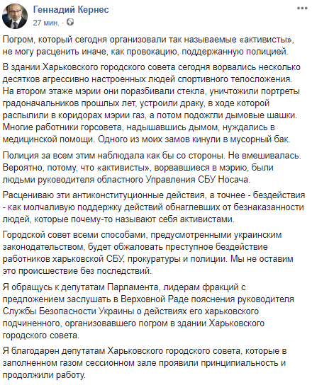 "Погром, который сегодня организовали так называемые "активисты", не могу расценить иначе, как провокацию, поддержанную полицией. В здании Харьковского городского совета сегодня ворвались несколько десятков агрессивно настроенных людей спортивного телосложения. На втором этаже мэрии они поразбивали стекла, уничтожили портреты градоначальников прошлых лет, устроили драку, в ходе которой распылили в коридорах мэрии газ, а потом подожгли дымовые шашки. Многие работники горсовета, надышавшись дымом, нуждались в медицинской помощи. Одного из моих замов кинули в мусорный бак", - написал мэр в Facebook.