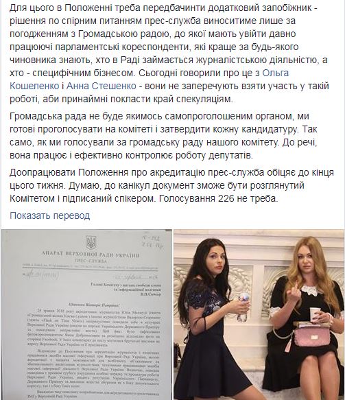 "В Раде не имеют возможности отказать в аккредитации журналисту, а торговля журналистскими удостоверениями, в том числе – с целью дальнейшего попадания в парламент, уже превратилась в уродливый бизнес", – заявила депутат.