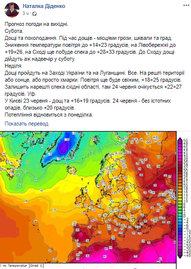 В субботу и воскресенье синоптики прогнозируют в Украине значительное понижение температуры. В частности, в субботу ожидаются дожди. Об этом сообщила в на своей странице в  Facebook синоптик Наталья Диденко.