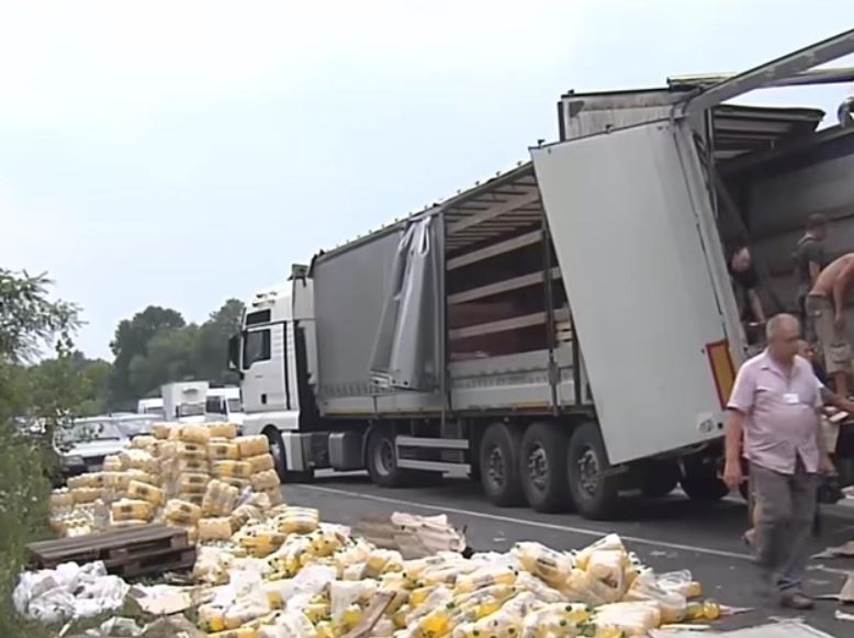 Грузовик перегородил дорогу и растерял груз, а это были сотни ящиков с газированной водой выпали на дорогу. В результате, часть воды из бутылок разлилась и трассу залило сладким лимонадом.