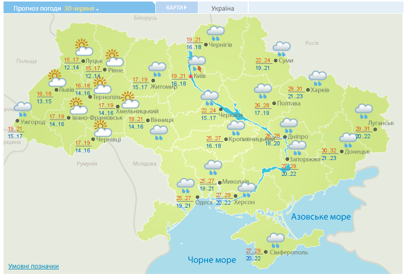 В субботу, 30 июня,  почти по всей территории Украины пройдут дожди. Об этом сообщает Укргидрометцентр.