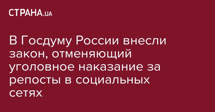 В Государственную Думу России внесен законопроект о декриминализации любых репостов в соцсетях или сообщений в "других ресурсах сети Интернет". Ныне уголовная ответственность за это предусматривается по части 1 статьи 282 УК РФ ("действия, направленные на возбуждение ненависти либо вражды с использованием средств массовой информации, в том числе сети Интернет").