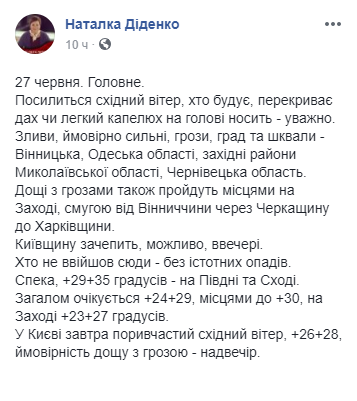 "27 июня. Главное. Усилится восточный ветер, кто строит, перекрывает крышу или легкую шляпу на голове носит – внимательно. Ливни, вероятно сильные грозы, град и шквалы – Винницкая, Одесская области, западные районы Николаевской области, Черновицкая область. Дожди с грозами также пройдут местами на западе, полосой от Винницкой, через Черкасскую к Харьковской области", - написала Наталка Диденко.