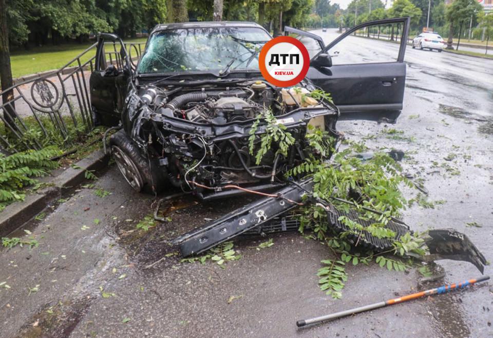 Audi 100 двигалась со стороны Демеевской площади по Голосеевскому в сторону Одесской площади. По неизвестной причине машина выехала на полосу встречного движения и врезалась в столб, потом снесла ограждение и дерево.