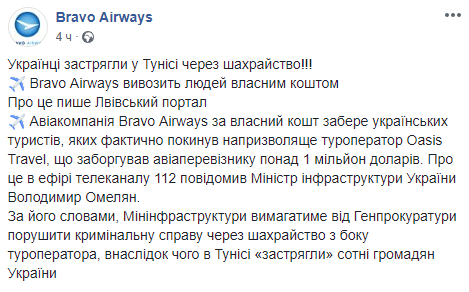 Украинская авиакомпания Bravo Airways, которая в последнее время оказалась в эпицентре громких скандалов, сообщает о мошенничестве туроператора "Оазис", который не рассчитался с компанией за авиаперелеты.