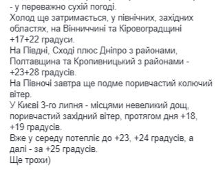 "В Киеве 3-го июля – местами небольшой дождь, порывистый западный ветер, в течение дня +18+19 градусов тепла", – добавила она.