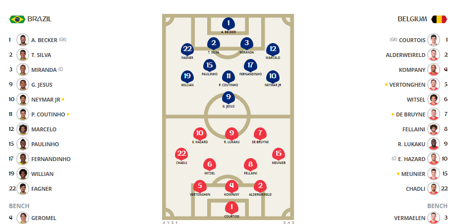 Бразилия: Алиссон - защита Фагнер, Тиаго Силва, Миранда, Марсело - полузащита Фернандиньо, Паулиньо - Виллиан, Филиппе Коутиньо, Неймар - нападающий Габриэл Жезус