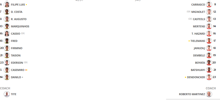 20:21 Наставник бельгийцев Роберто Мартинес внес два изменения в состав, которые многие ожидали (и надеялись). Маруан Феллайни, вероятно, использует свою физическую силу в центре (и его рост, чтобы выигрывать "воздух") на позиции Кевина де Брюйне, который теперь будет играть впереди - рядом с Иденом Азаров, за Ромелу Лукаку. Шадли занял позицию Карраско слева. С Менье справа они могут стать ключом к матчу, так как в их задачу войдет помощь трем центральным защитникам команды во время бразильских атак.