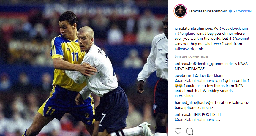 "Хай, Дэвид! Если победит Англия, я оплачу тебе ужин в любом ресторане мира. Если же выиграет Швеция, ты купишь мне все, что я захочу, в магазине IKEA", - ненавязчиво Ибрагимович упомянул торговую марку.