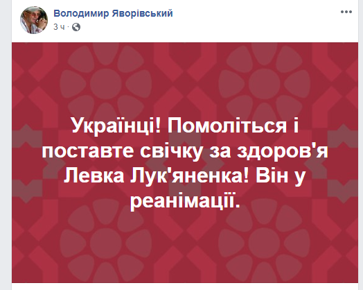 "Украинцы! Помолитесь и поставьте свечку за здоровье Левко Лукьяненко! Он в реанимации", - рассказал Яворивский.