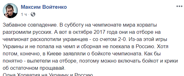 "Забавное совпадение. В субботу на чемпионате мира хорваты разгромили русских. А вот в октябре 2017 года они на отборе на чемпионат расколотили украинцев - со счетом 2-0. Из-за этой игры Украины и не попала на чемп и сборная не поехала в Россию. Хотя потом, конечно, в Киеве заявляли о бойкоте чемпионата. Как бы понятно - вылетели на отборе, поэтому можно включать бойкот и крики об остаточном прощавай.