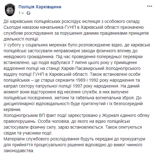 "В субботу в социальных сетях было распространено видео, где харьковские полицейские применили неправомерные меры физического воздействия к неизвестному гражданину. Во время проведения предварительной проверки установлено, что событие произошло 7 июля этого года в помещении отделения полиции на станции Харьков-Пассажирский Холодногорского отдела полиции ГУНП в Харьковской области", - указывается в сообщении.