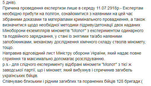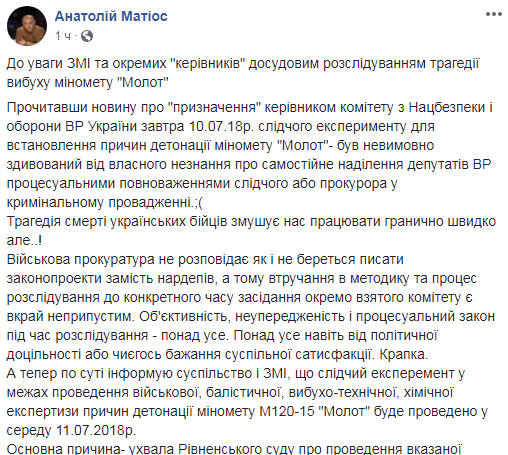 "Следственный эксперимент в рамках проведения военной, баллистической, взрывотехнической, химической экспертизы причин детонации миномета М120-15 "Молот" пройдет в среду 11.07.2018 года. Основная причина – решение Ровенского суда о проведении указанной экспертизы специалистами КНИИСЭ (Киевский научно-исследовательский институт судебных экспертиз - Прим.Ред.) получена следствием лишь в 17:00, сегодня, 09.07.2018г.", - написал Матиос на своей странице в соцсети Фейсбук в понедельник.
