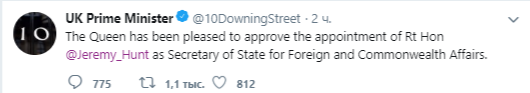 "Королева была рада одобрить назначение достопочтенного Джереми Ханта в качестве министра иностранных дел и по делам Содружества Наций", - говорится в сообщении Даунинг-стрит в Twitter.