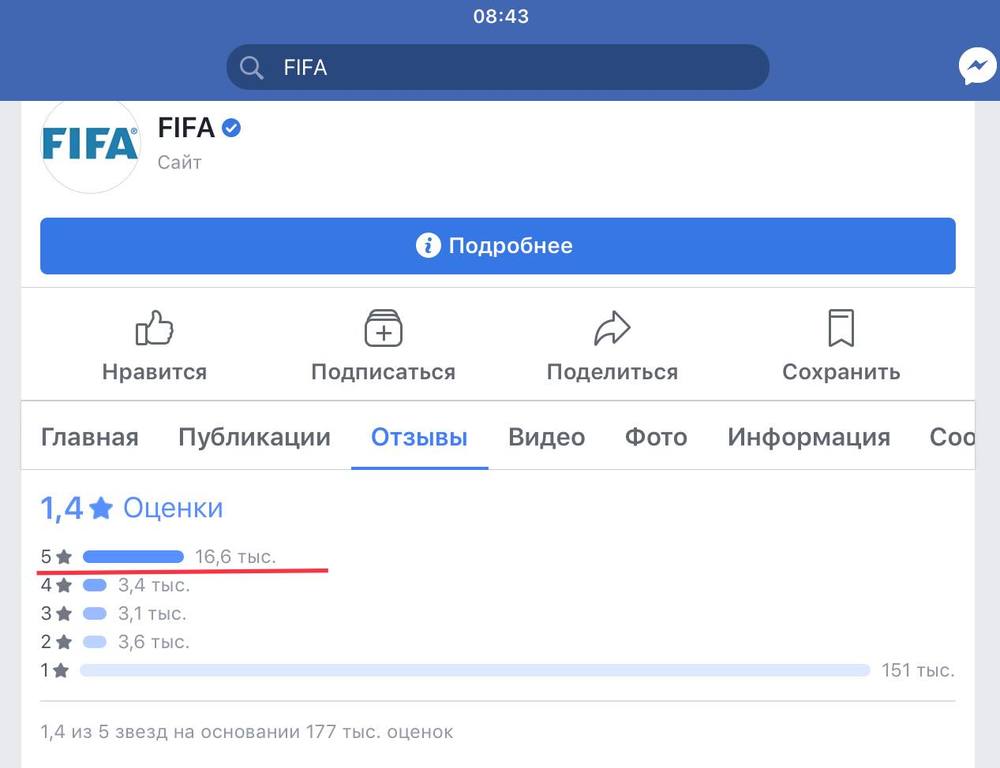 В итоге сейчас рейтинг страницы FIFA составляет чуть больше одного балла.