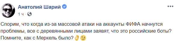 "Спорим, что когда из-за массовой атаки на аккаунты ФИФА начнутся проблемы, все с деревянными лицами заявят, что это российские боты? Помните, как с Меркель было?"