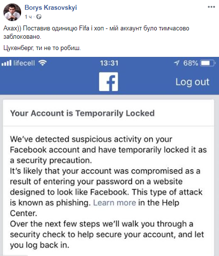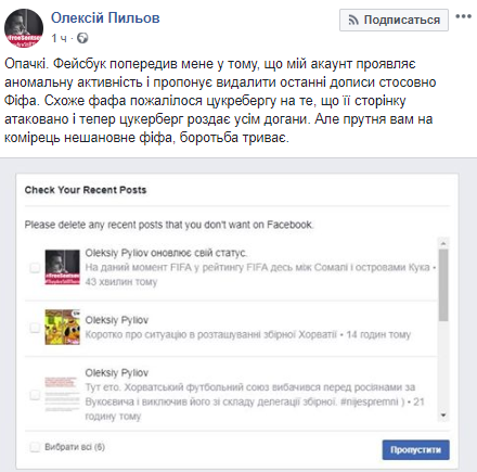 "Похоже ФИФА пожаловалась Цукербергу на то, что ее страницу атаковали и теперь Цукерберг раздает всем выговоры", - отметил Алексей Пылев на своей странице.