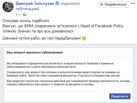 "Вангую, что ФИФА оперативно связались с Head of Facebook Policy Ульяной Зининой и обо всем договорились. Уважаемые Путино-рабы, вы такие предсказуемые", - высказался заместитель министра информационной политики Дмитрий Золотухин.