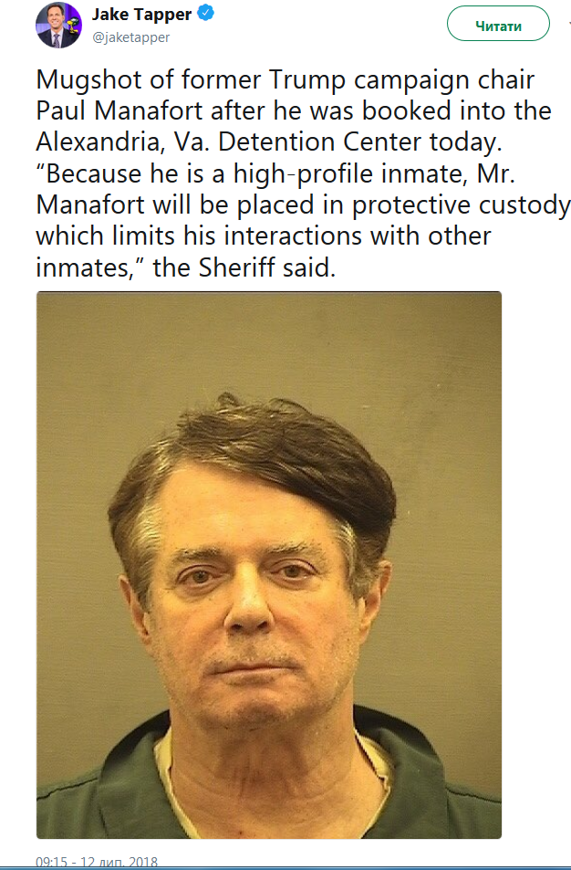 Репортер CNN Джейк Таппер опубликовал в своем Twitter фото бывшего руководителя предвыборной кампании Дональда Трампа Пола Манафорта, которого 12 июля перевели в тюрьму Александрии, штат Вирджиния.