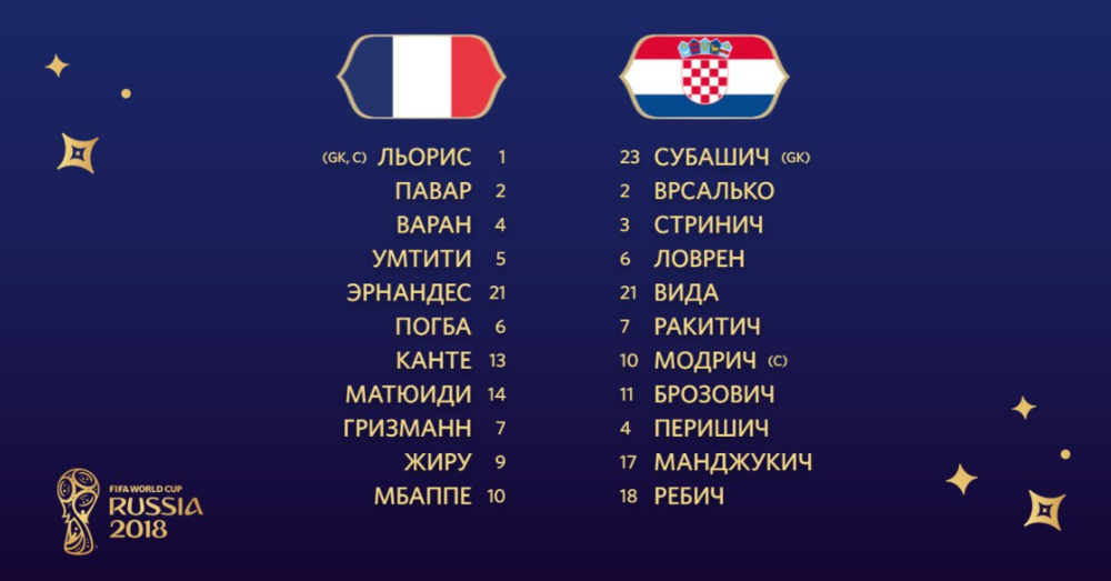 Французы выйдут на поле в сильнейшем составе – с Гризманном и Мбаппе в старте. У хорватов с первых минут появятся на поле Вида и Перишич, участие которого до последнего оставалось под вопросом. Динамовец Йосип Пиварич сможет появиться на поле, выйдя на замену.