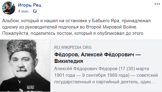 Сегодня, 18 июля, на троллейбусной остановке у Бабьего Яра прохожие нашли 2 из 4 распотрошенных фотоальбома дважды героя Советского союза Александра Федоровича Федорова за 1941-1944 годы. Об этом рассказал журналист Игорь Рец на своей странице в Facebook.