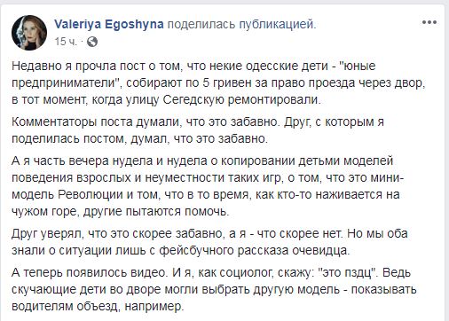 Одним пользователям импонирует предприимчивость юных одесситов. Однако, есть и возмущенные. Так, журналист Валерия Егошина в Facebook отмечает, что происходит копировании детьми моделей поведения взрослых, а также о неуместности таких игр.