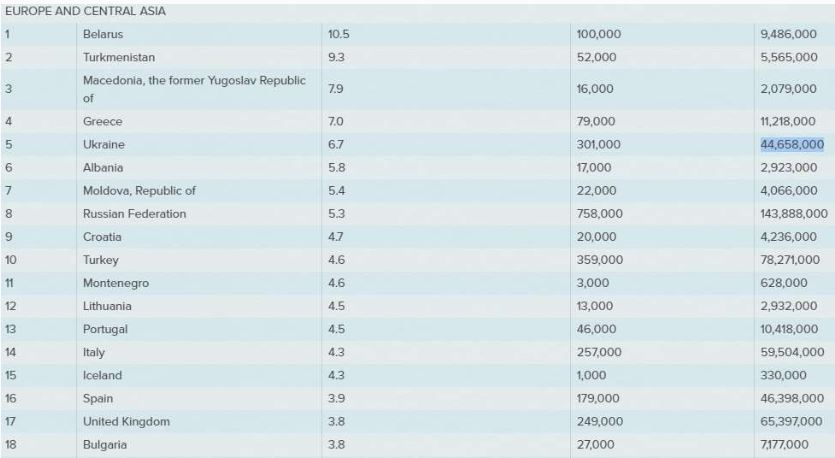 Среди стран Европы и Центральной Азии Украина оказалась на пятом месте среди стран с самым высоким уровнем современного рабства, где Беларусь - на первом, а Россия - на восьмом. Согласно данным в таблице по регионам мира, абсолютное количество жертв этого явления в Украине составляет 301 тысяча.