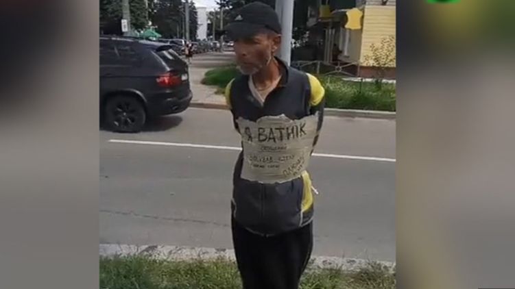 В Чернигове мужчину привязали к столбу на улице, повесив ему на грудь табличку с надписью "Я ватник опущенный".