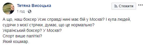 "А что, наш боксер Усик дерется в Москве? И многие, судя по моей ленте, думают, что это нормально?.. Кошмар", - пишет телеведущая Татьяна Высоцкая.