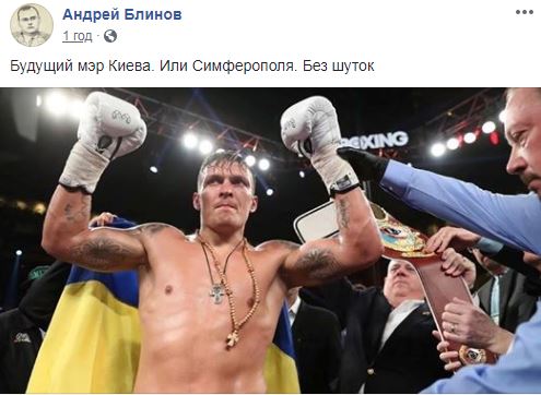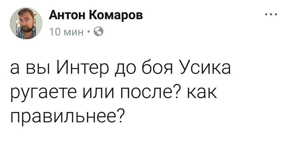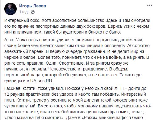 "А вот Усик очень приятно удивляет, помимо спортивных достижений, своим более чем джентльменским отношением к оппоненту. Абсолютно адекватный парень. В первую очередь гражданин. И не делит мир на черное и белое. Более того, понимает, что он не на войне, а на ринге. В ринге есть правила. Одни. Спортивные. И за рингом сразу же начинаются правила. Человеческие и гражданские. В общем, нормальный пацан, который объединяет, а не нагнетает. Таких ведь единицы и в UA, и в RU".