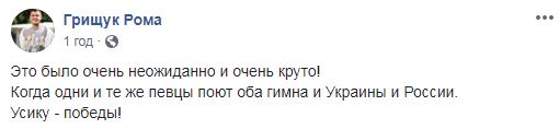 "Это было очень неожиданно и очень круто! Когда одни и те же певцы поют оба гимна и Украины и России. Усику - победы!" – написал руководитель шоу "Мамахохотала" Роман Грищук.