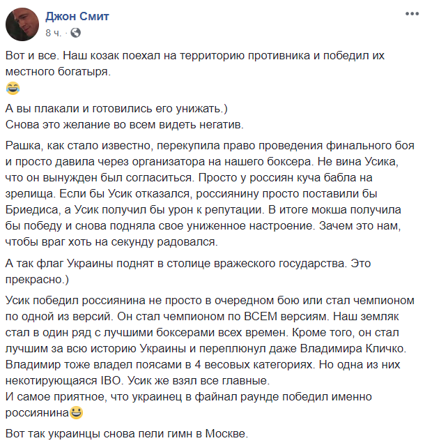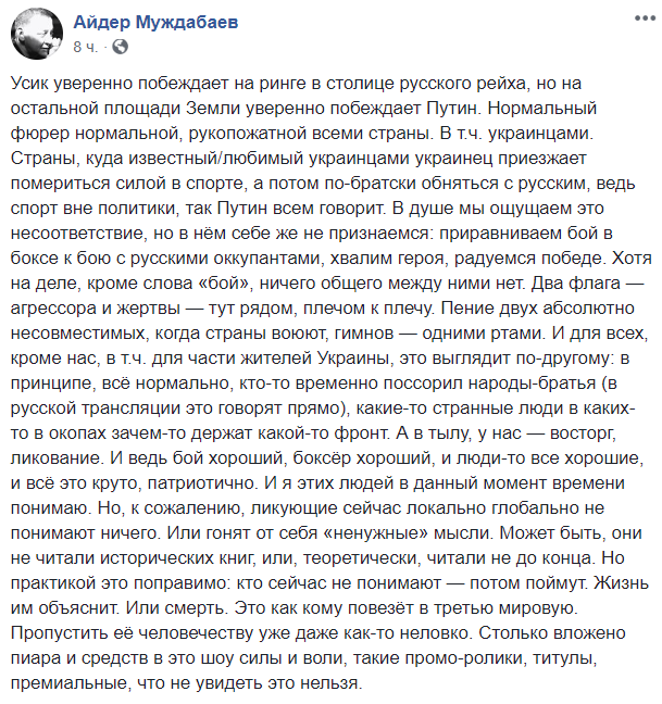 "Усик уверенно побеждает на ринге в столице русского рейха, но на остальной площади Земли уверенно побеждает Путин. Нормальный фюрер нормальной, рукопожатной всеми страны. В т.ч. украинцами. Страны, куда известный/любимый украинцами украинец приезжает помериться силой в спорте, а потом по-братски обняться с русским, ведь спорт вне политики, так Путин всем говорит.