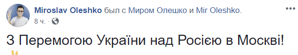 "С Победой Украины над Россией в Москве!", - радуется скандальный блогер Мирослав Олешко.