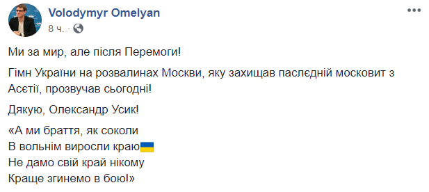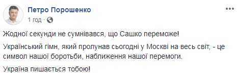 "Украинский гимн, сыгранный сегодня в Москве на весь мир - это символ нашей борьбы, приближение нашей победы", - написал через мгновения после объявления результатов официальный аккаунт президента Петра Порошенко, который, по его словам, "ни секунды не сомневался" в Александре.