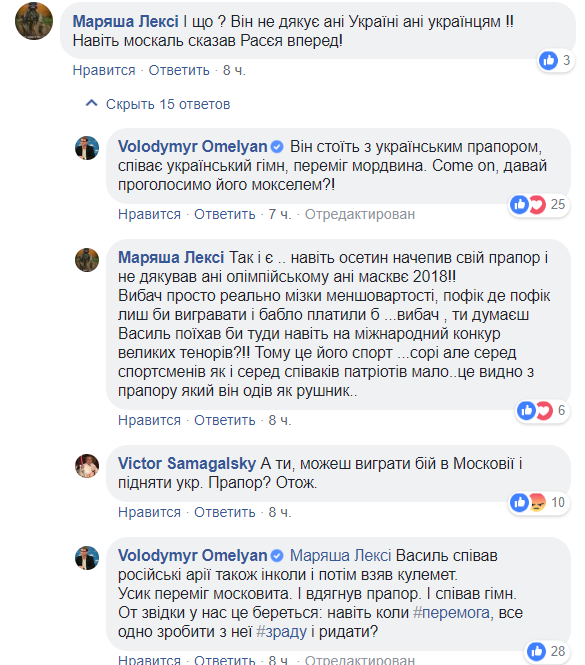 А некоторые читатели страницы Омеляна наоборот упрекнули его в поддержке Усика - хотя тот говорил по-русски и не высказывал пренебрежения к "москалям". Министр даже вступил в эту дискуссию и попытался "спасти честь" боксера в глазах националистов.