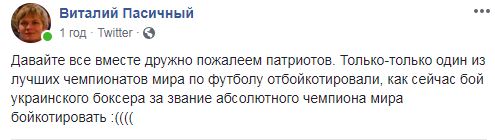 "Давайте все вместе дружно пожалеем патриотов. Только-только один из лучших чемпионатов мира по футболу отбойкотировали, как сейчас бой украинского боксера за звание абсолютного чемпиона мира бойкотировать", - пишет спортивный журналист Виталий Пасичный.