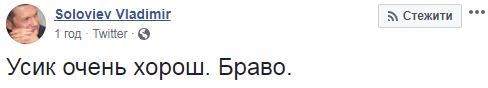 "Усик очень хорош. Браво", - краткий итог от одного из самых эпатажных голосов кремлевской журналистики Владимира Соловьева.