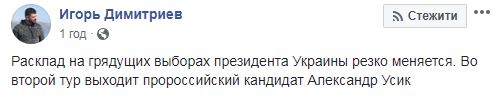 "Расклад на грядущих выборах президента Украины резко меняется. Во второй тур выходит пророссийский кандидат Александр Усик", - пишет экс-депутат горсовета Одессы Игорь Димитриев.