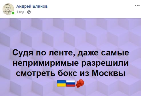 "Судя по ленте, даже самые непримиримые разрешили смотреть бокс из Москвы", - солидарен уже экономический журналист Андрей Блинов.