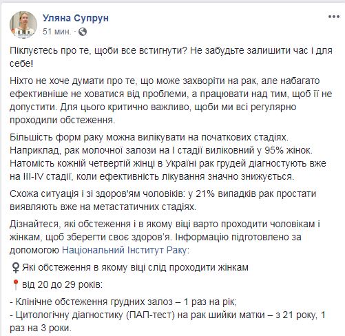 "Например, рак молочной железы на I стадии излечим в 95% женщин. Зато каждой четвертой женщине в Украине рак груди диагностируют уже на III-IV стадии, когда эффективность лечения значительно снижается. Похожая ситуация и со здоровьем мужчин: в 21% случаев рак простаты выявляют уже на метастатических стадиях", - написала она.