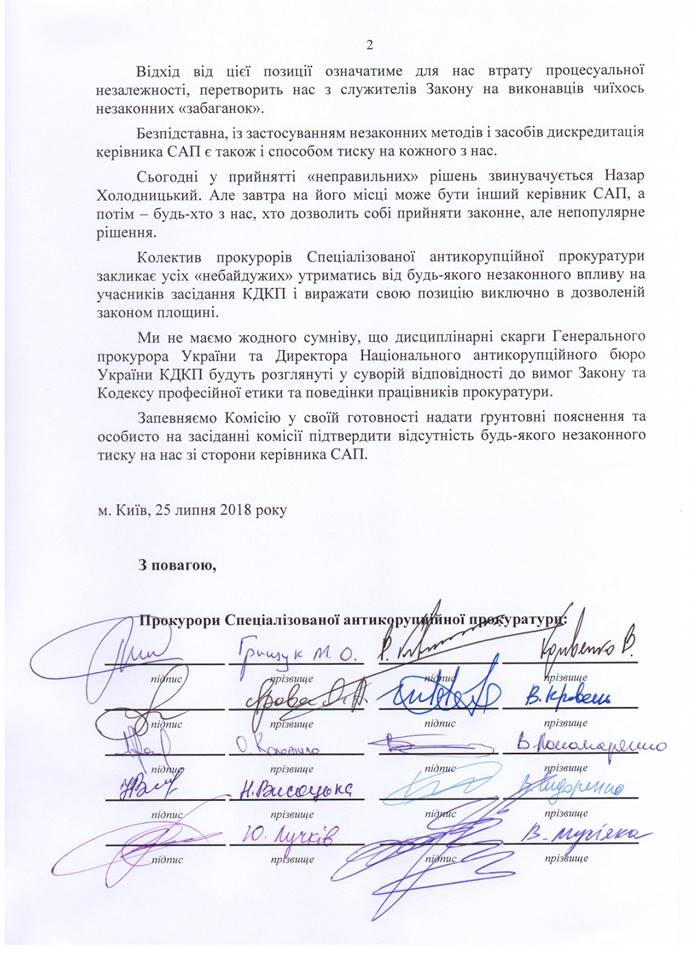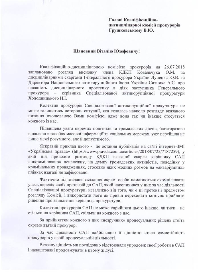 Прокуроры Специализированной антикоррупционной прокуратуры (САП) написали открытое письмо главе Квалификационно-дисциплинарной комиссии прокуроров Грушковскому перед  рассмотрением комиссией дела главы САП Назара Холодницкого, которое запланировано на 26 июля. Текст письма опубликован на странице ведомства в Facebook.