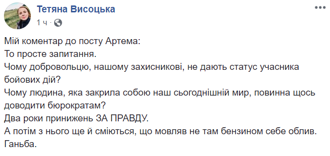 Комментарий к посту Артема. Это простой вопрос. Почему добровольцу, нашему защитнику, не дают статус участника боевых действий?
