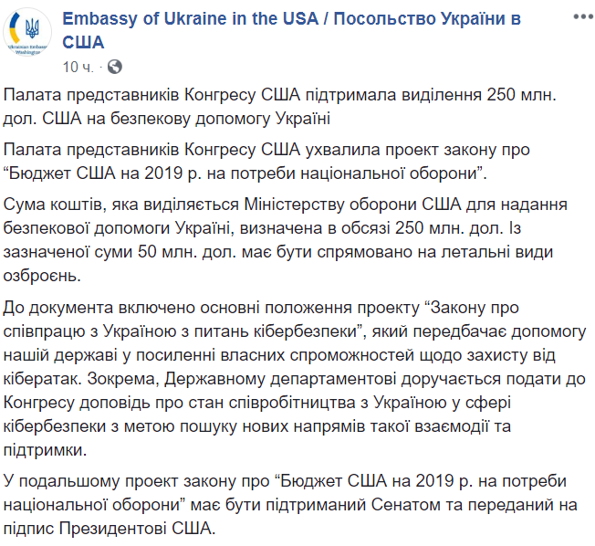 Палата представителей Конгресса США поддержала выделение 250 миллионов долларов на военную помощь Украине в 2019 году.