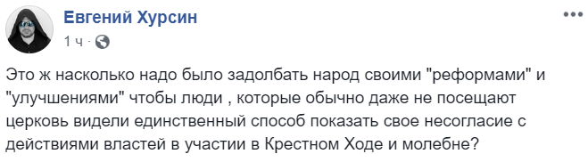 "Это ж насколько надо было задолбать народ своими "реформами" и "улучшениями", чтобы люди, которые обычно даже не посещают церковь, видели единственный способ показать свое несогласие с действиями властей в участии в Крестном Ходе и молебне?" – пишет блогер Евгений Хурсин.