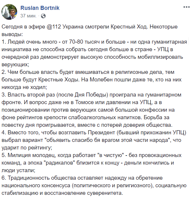 Политолог Руслан Бортник делает несколько выводов из крестного хода. Главный из них – власть второй раз после Дня Победы проиграла на гуманитарном фронте. А то, что Петр Порошенко не пришел к верующим и ни словом не поддержал их, ставит вопросы – президент ли он всех украинцев.