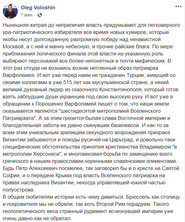 По мере приближения логического финала этой власти на указанную роль выбирают персонажей все более непонятных и почти мифических. В этот раз откуда ни возьмись возник нетленный образ патриарха Варфоломея. И вот уже перед нами не гражданин Турции, живущий со своими коллегами в уже 515 лет как мусульманской стране, а некий великий духовный лидер из сказочного Константинополя, который готов взять заблудшие души украинцев под свою высокую руку.