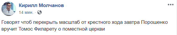 "Говорят, чтоб перекрыть масштаб от Крестного хода завтра Порошенко вручит Томос Филарету о поместной церкви", – шутит блогер Кирилл Молчанов.