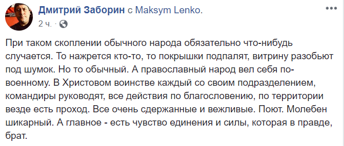 "При таком скоплении обычного народа обязательно что-нибудь случается. То нажрется кто-то, то покрышки подпалят, витрину разобьют под шумок. Но то обычный. А православный народ вел себя по-военному. В Христовом воинстве каждый со своим подразделением, командиры руководят, все действия по благословению, по территории везде есть проход. Все очень сдержанные и вежливые. Поют. Молебен шикарный. А главное – есть чувство единения и силы, которая в правде, брат".